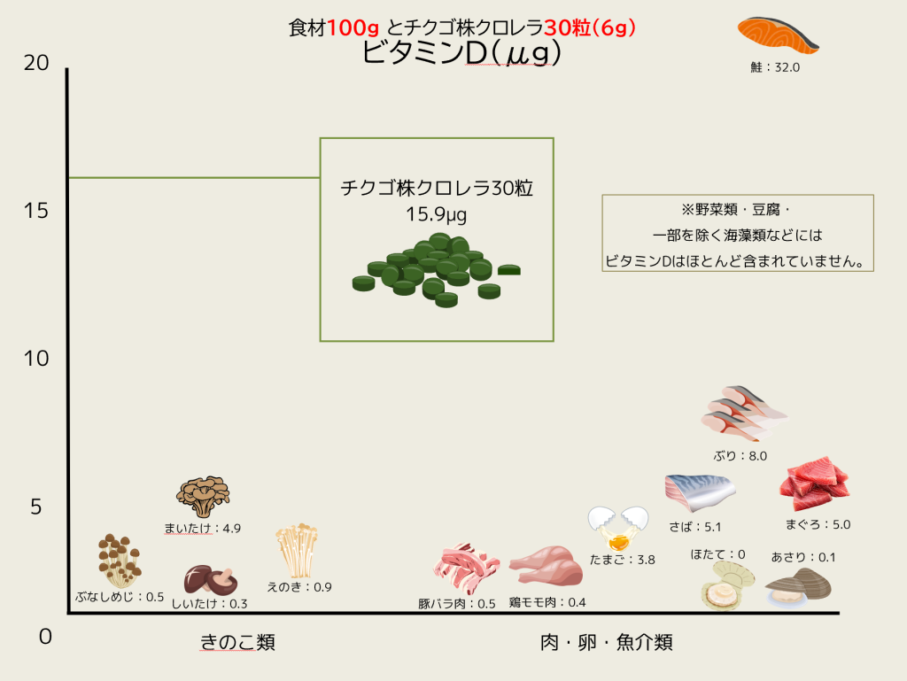 「ビタミンDを含む食材」として広く知られているきのこ類や魚介類のほか、身近な食品(100g)とチクゴ株クロレラ30粒(6g)を比較してみると、クロレラからもしっかりとビタミンDの補給ができることがわかります。